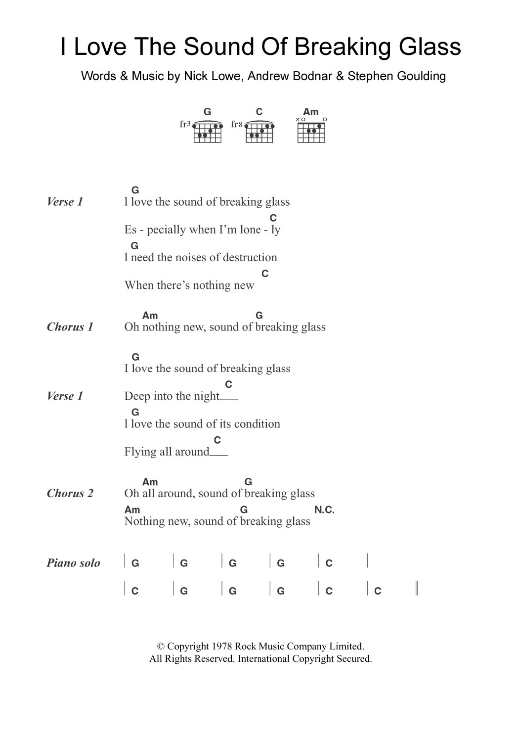 Download or print Nick Lowe I Love The Sound Of Breaking Glass sheet music, chords and digital score arranged for Guitar Chords/Lyrics. This Rock score includes 2 page(s).