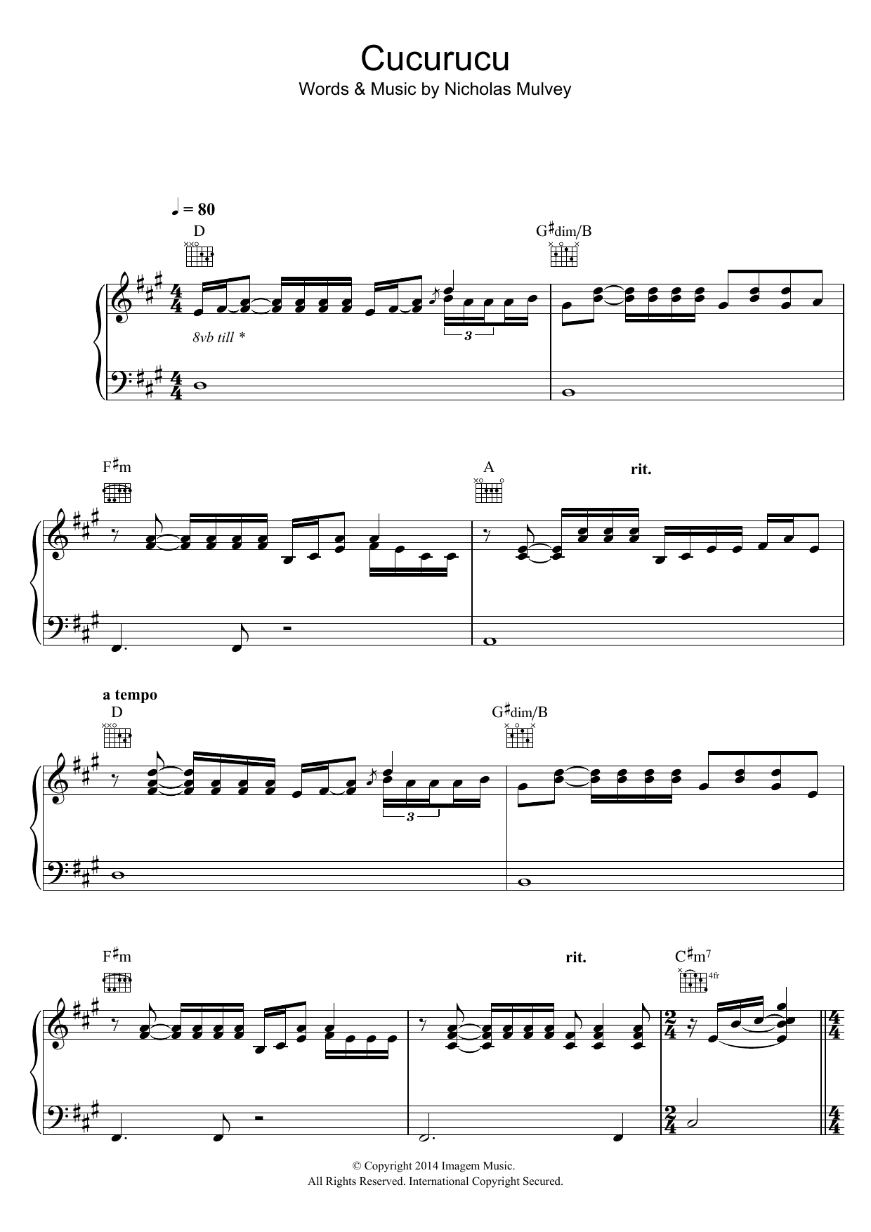 Download or print Nick Mulvey Cucurucu sheet music, chords and digital score arranged for Guitar Chords/Lyrics. This Pop score includes 3 page(s).