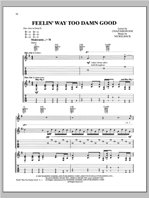 Download or print Nickelback Feelin' Way Too Damn Good sheet music, chords and digital score arranged for Guitar Tab. This Pop score includes 15 page(s).