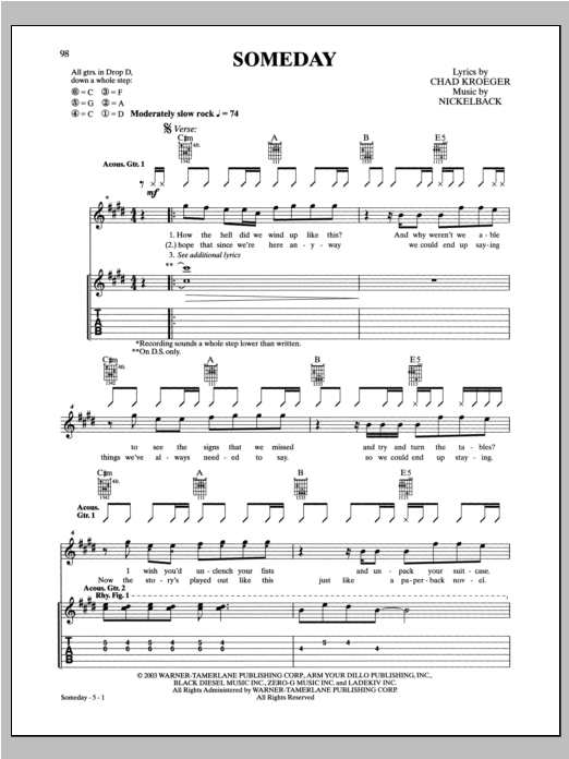 Download or print Nickelback Someday sheet music, chords and digital score arranged for Guitar Tab. This Pop score includes 15 page(s).
