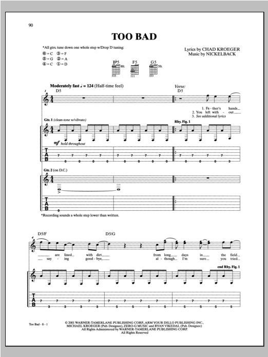 Download or print Nickelback Too Bad sheet music, chords and digital score arranged for Guitar Tab. This Pop score includes 15 page(s).