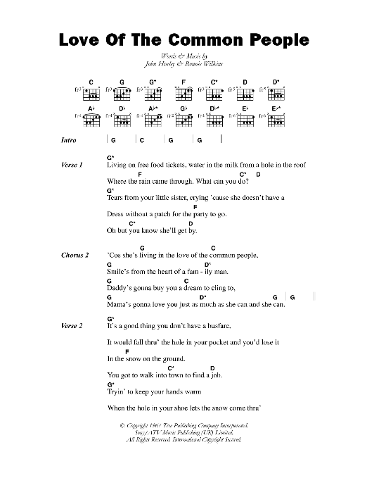 Download or print Nicky Thomas Love Of The Common People sheet music, chords and digital score arranged for Guitar Chords/Lyrics. This Reggae score includes 2 page(s).