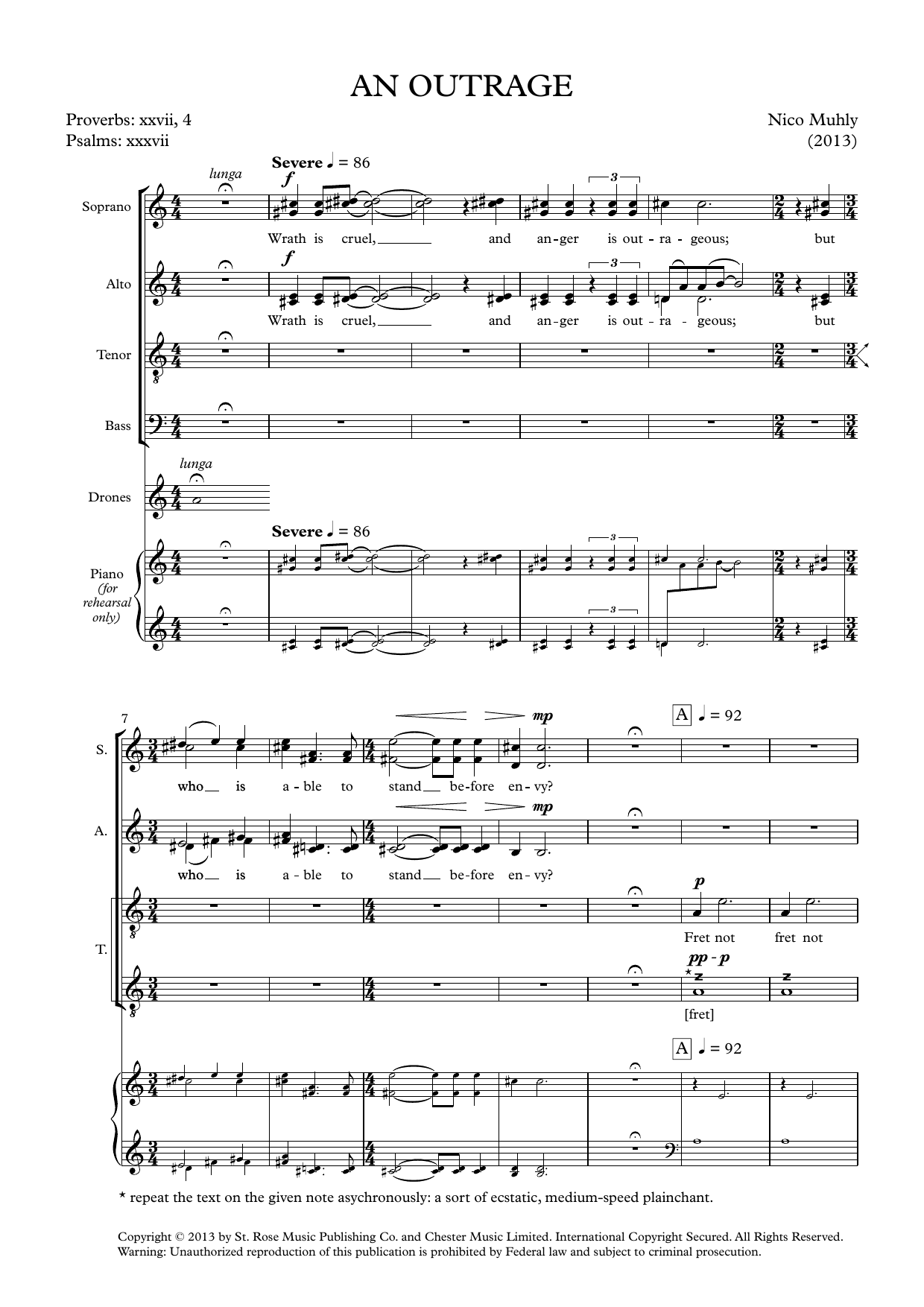 Download or print Nico Muhly An Outrage sheet music, chords and digital score arranged for SATB Choir. This Classical score includes 29 page(s).