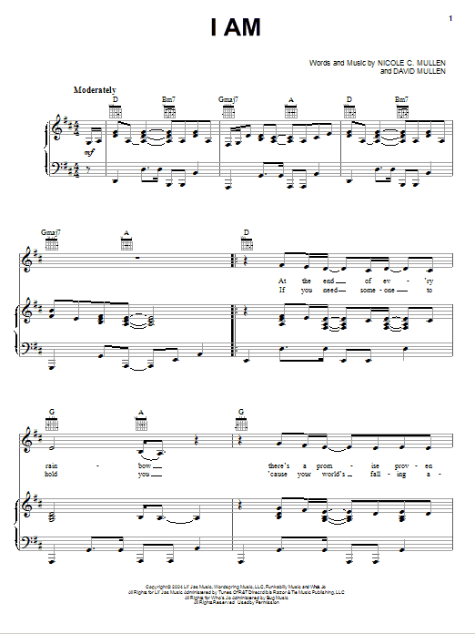 Download or print Nicole C. Mullen I Am sheet music, chords and digital score arranged for Piano, Vocal & Guitar Chords (Right-Hand Melody). This Christian score includes 7 page(s).