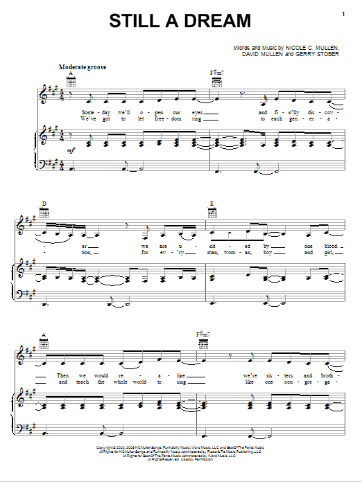 Download or print Nicole C. Mullen Still A Dream sheet music, chords and digital score arranged for Piano, Vocal & Guitar Chords (Right-Hand Melody). This Christian score includes 5 page(s).