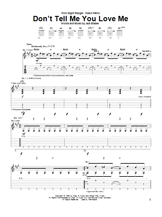 Download or print Night Ranger Don't Tell Me You Love Me sheet music, chords and digital score arranged for Guitar Tab. This Pop score includes 12 page(s).