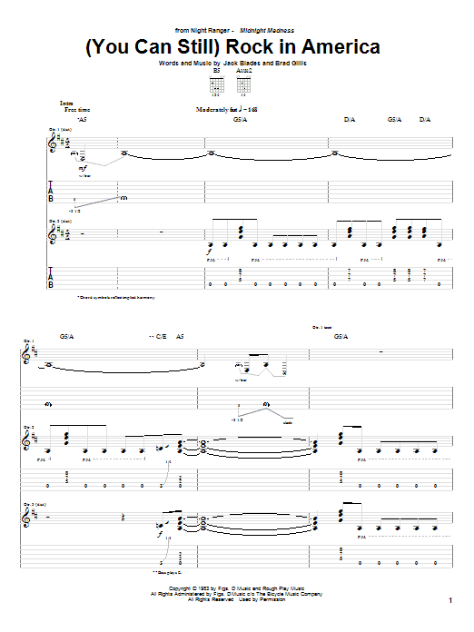 Download or print Night Ranger (You Can Still) Rock In America sheet music, chords and digital score arranged for Guitar Tab. This Pop score includes 13 page(s).