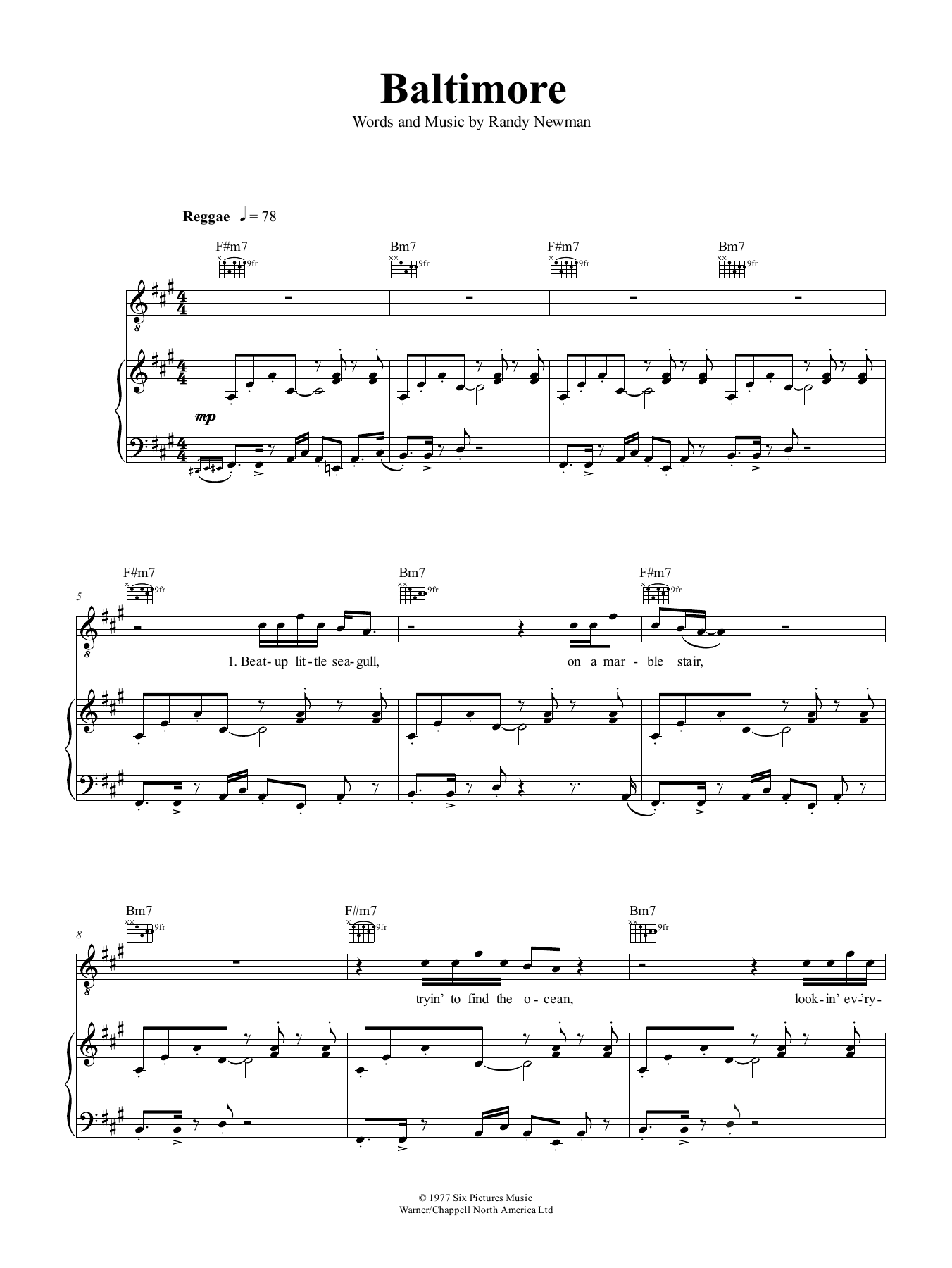Download or print Nina Simone Baltimore sheet music, chords and digital score arranged for Piano, Vocal & Guitar Chords (Right-Hand Melody). This Jazz score includes 7 page(s).