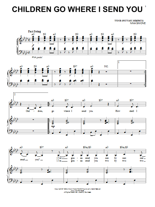 Download or print Nina Simone Children Go Where I Send You sheet music, chords and digital score arranged for Piano & Vocal. This Blues score includes 9 page(s).