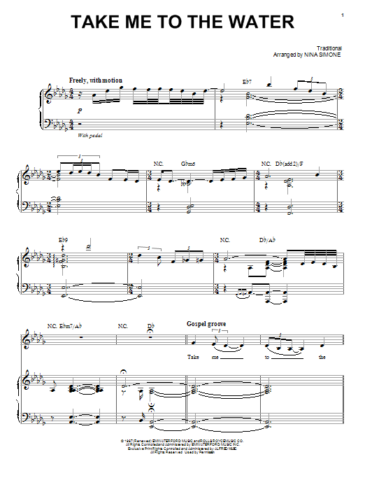 Download or print Nina Simone Take Me To The Water sheet music, chords and digital score arranged for Piano & Vocal. This Blues score includes 5 page(s).