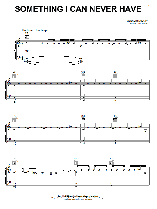 Download or print Nine Inch Nails Something I Can Never Have sheet music, chords and digital score arranged for Piano, Vocal & Guitar Chords (Right-Hand Melody). This Pop score includes 9 page(s).