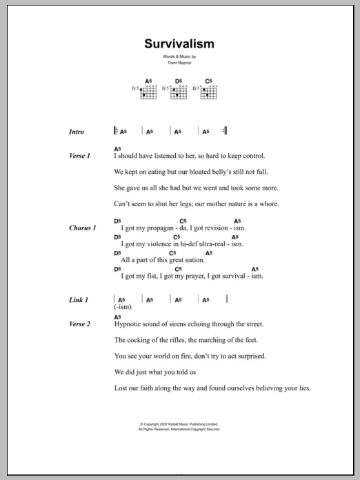 Download or print Nine Inch Nails Survivalism sheet music, chords and digital score arranged for Guitar Chords/Lyrics. This Rock score includes 2 page(s).