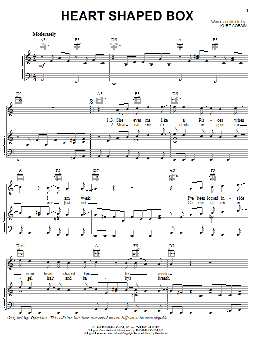 Download or print Nirvana Heart Shaped Box sheet music, chords and digital score arranged for Guitar Tab. This Alternative score includes 9 page(s).