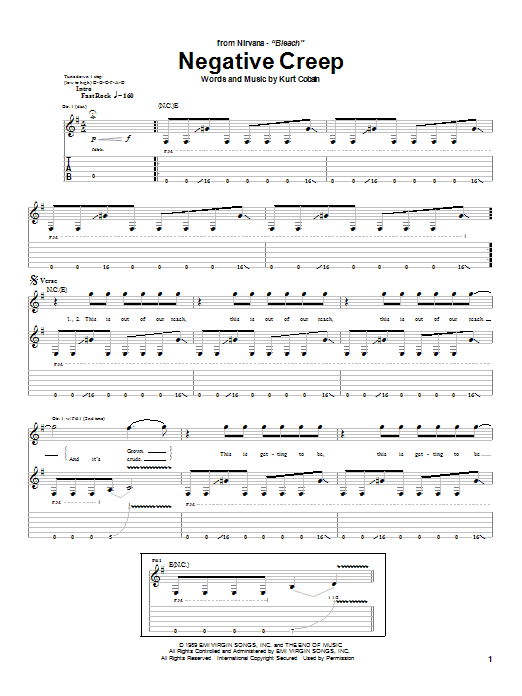 Download or print Nirvana Negative Creep sheet music, chords and digital score arranged for Piano, Vocal & Guitar Chords (Right-Hand Melody). This Rock score includes 4 page(s).