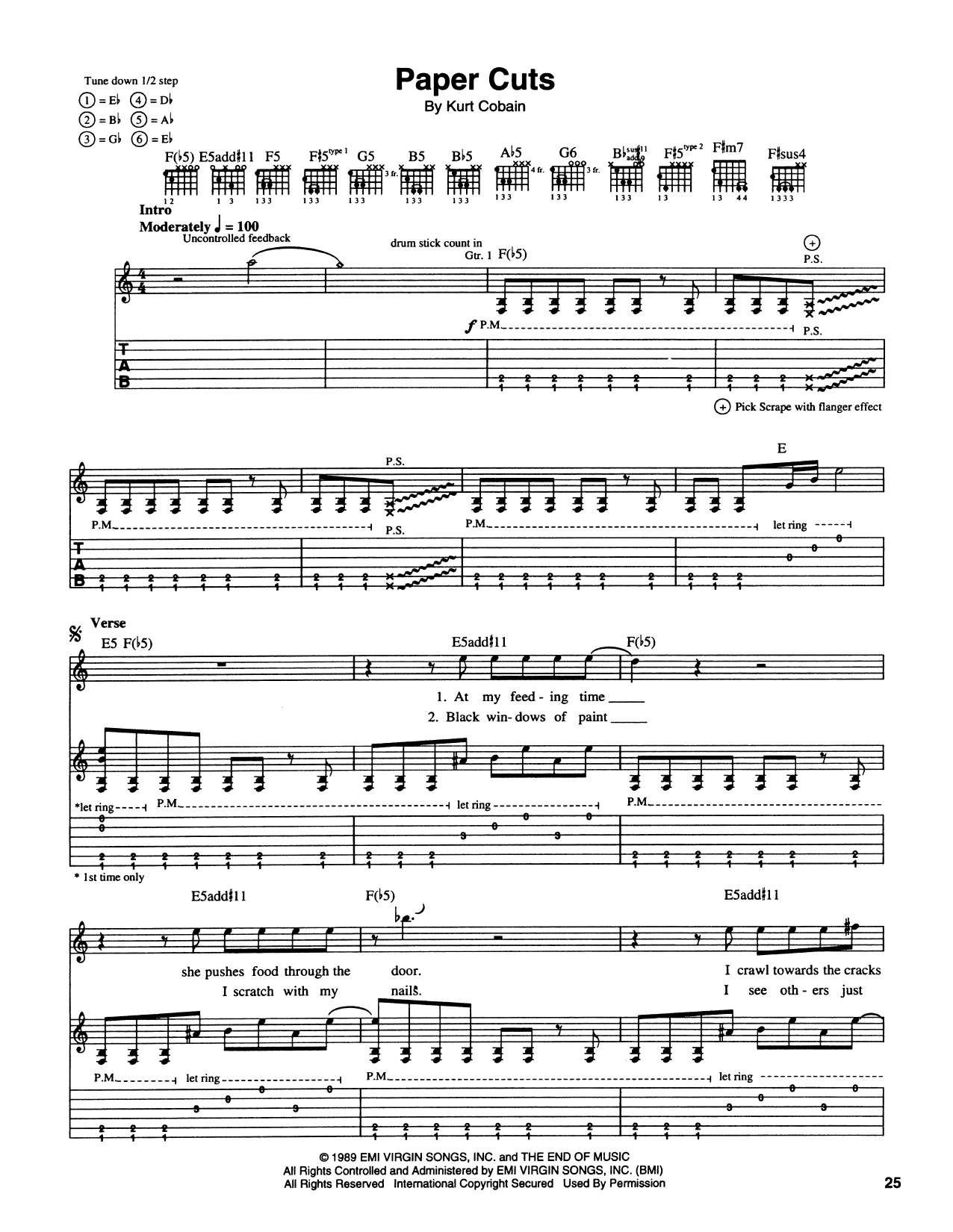 Download or print Nirvana Paper Cuts sheet music, chords and digital score arranged for Piano, Vocal & Guitar Chords (Right-Hand Melody). This Rock score includes 5 page(s).