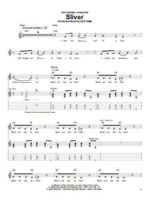 Download or print Nirvana Sliver sheet music, chords and digital score arranged for Guitar Tab. This Alternative score includes 3 page(s).
