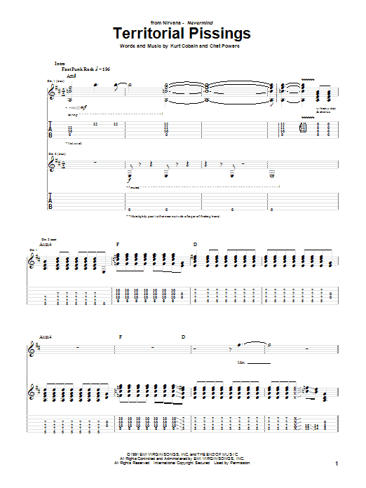 Download or print Nirvana Territorial Pissings sheet music, chords and digital score arranged for Piano, Vocal & Guitar Chords (Right-Hand Melody). This Rock score includes 4 page(s).