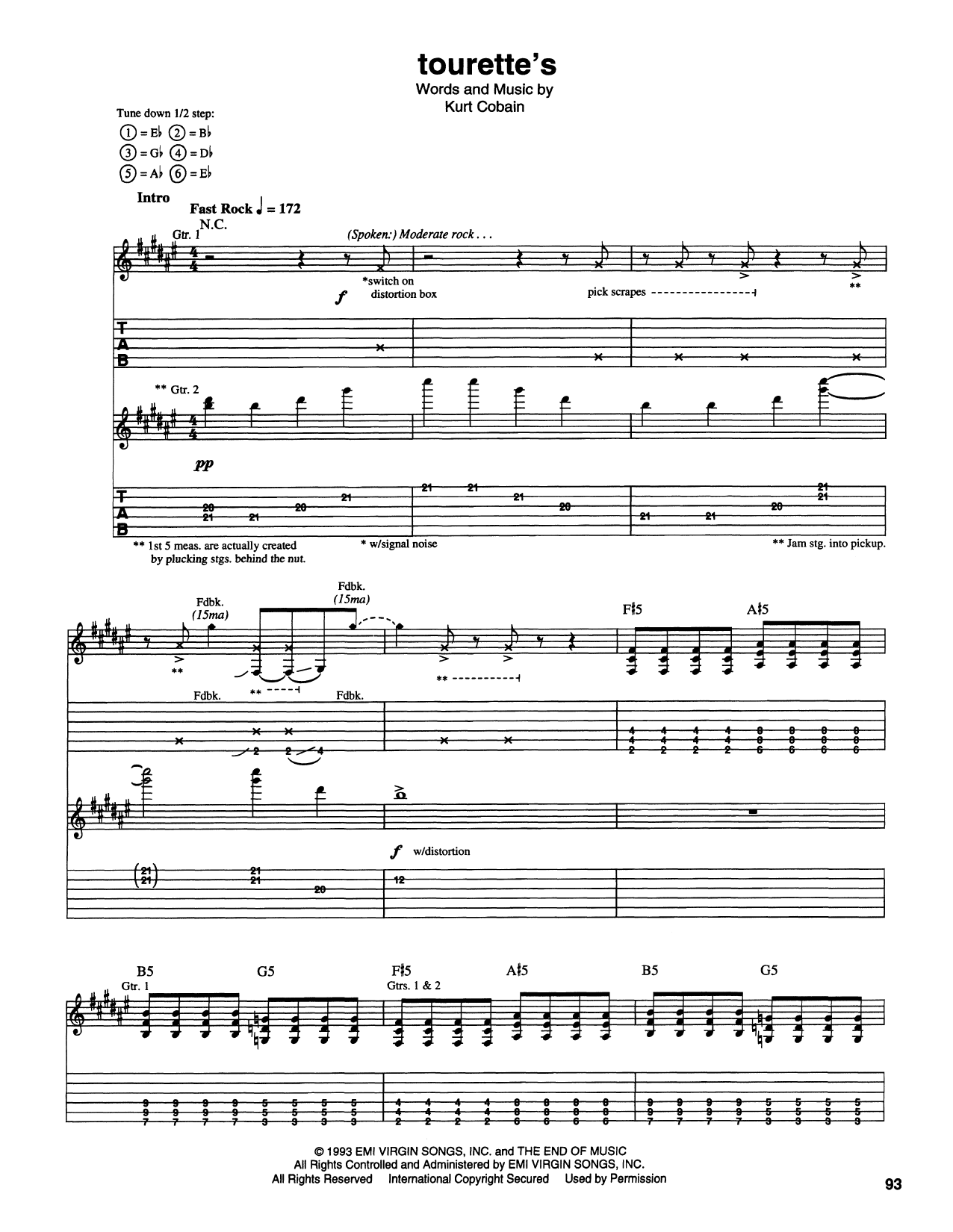 Download or print Nirvana Tourrets sheet music, chords and digital score arranged for Guitar Tab. This Alternative score includes 4 page(s).