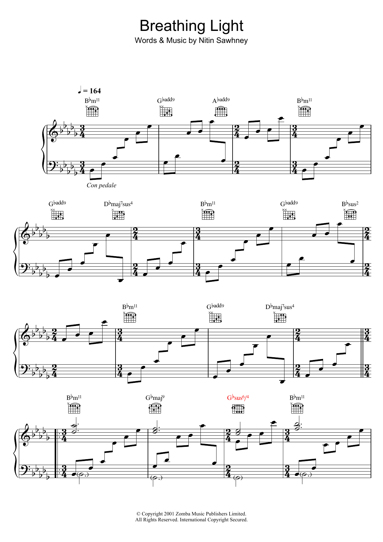 Download or print Nitin Sawhney Breathing Light sheet music, chords and digital score arranged for Piano Solo. This Jazz score includes 5 page(s).