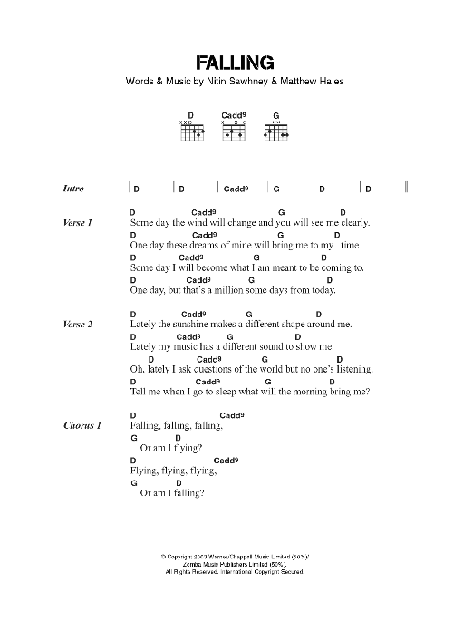 Download or print Nitin Sawhney Falling sheet music, chords and digital score arranged for Guitar Chords/Lyrics. This Pop score includes 2 page(s).