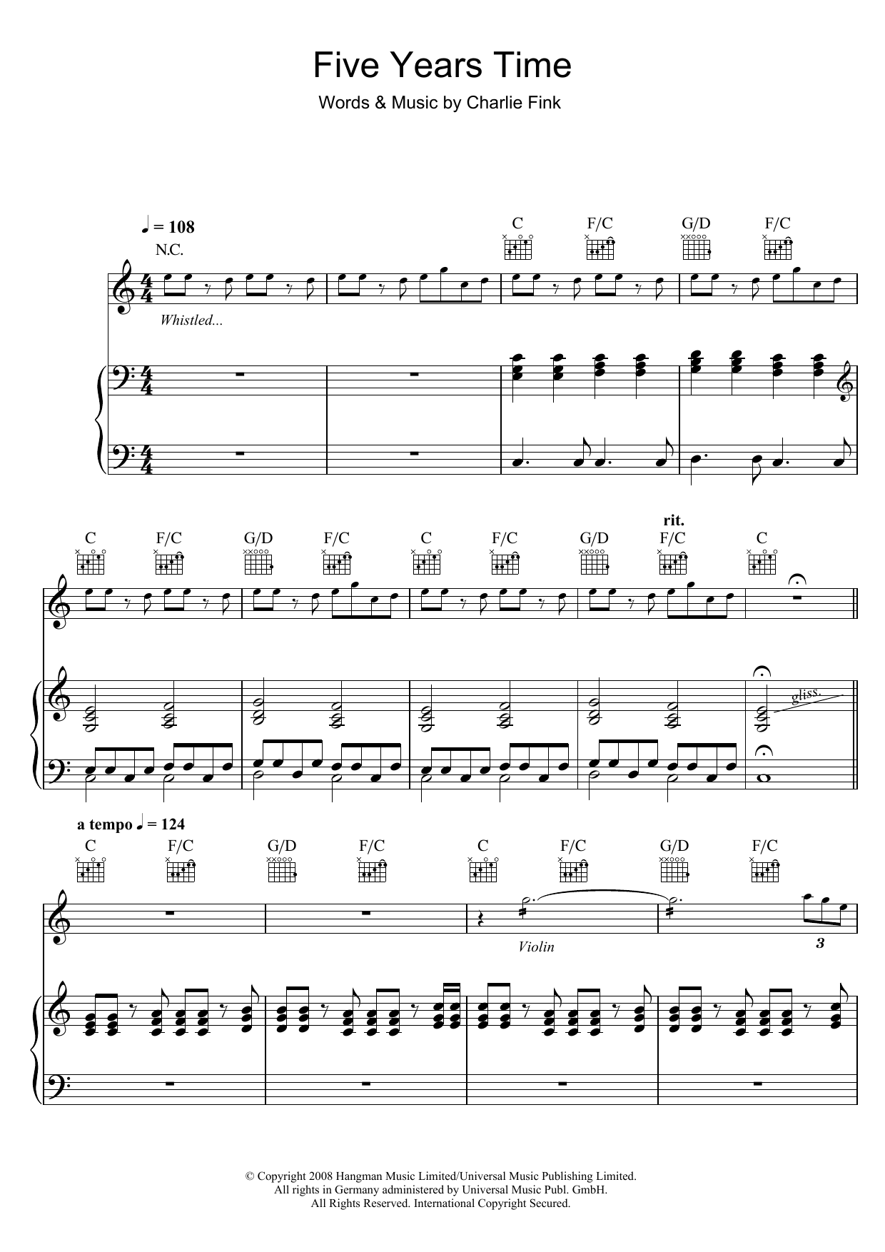 Download or print Noah And The Whale 5 Years Time sheet music, chords and digital score arranged for Piano, Vocal & Guitar Chords (Right-Hand Melody). This Folk score includes 10 page(s).