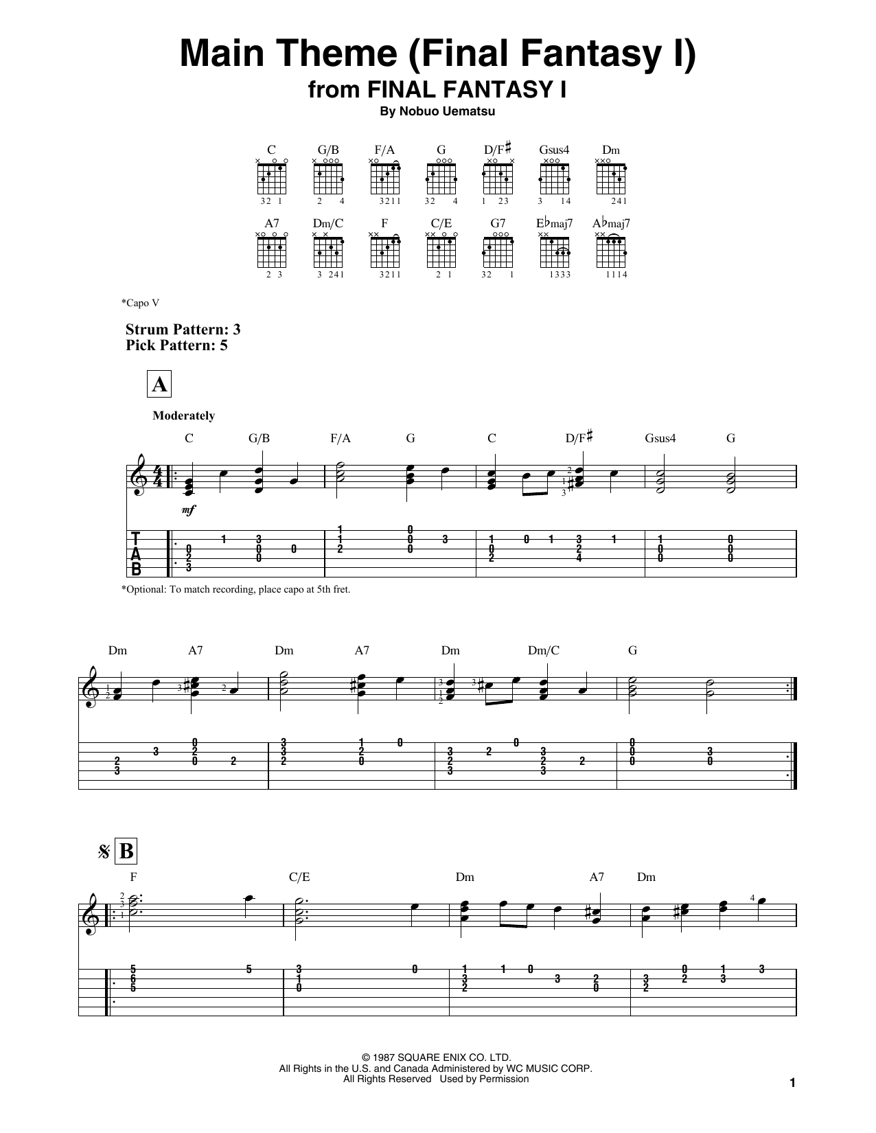Download or print Nobuo Uematsu Main Theme (Final Fantasy I) sheet music, chords and digital score arranged for Solo Guitar. This Video Game score includes 2 page(s).
