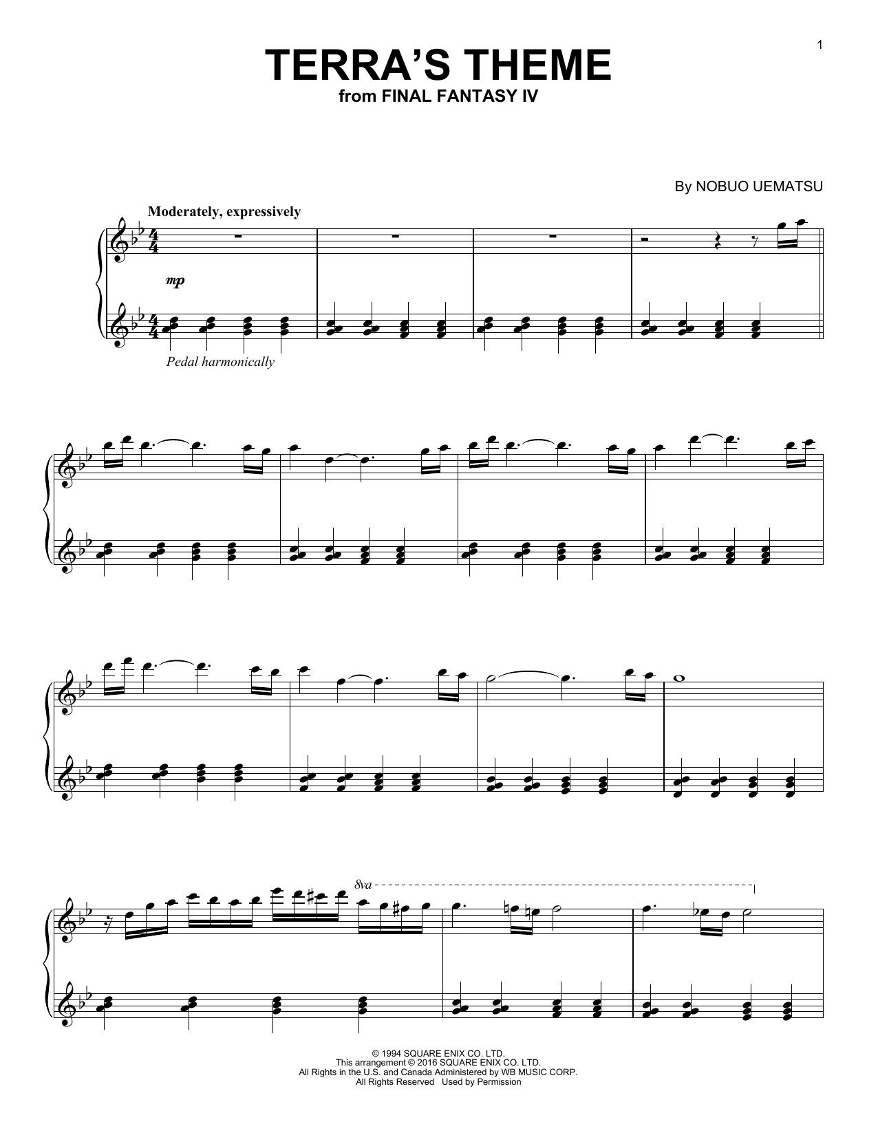 Download or print Nobuo Uematsu Terra's Theme sheet music, chords and digital score arranged for Piano Solo. This Pop score includes 4 page(s).