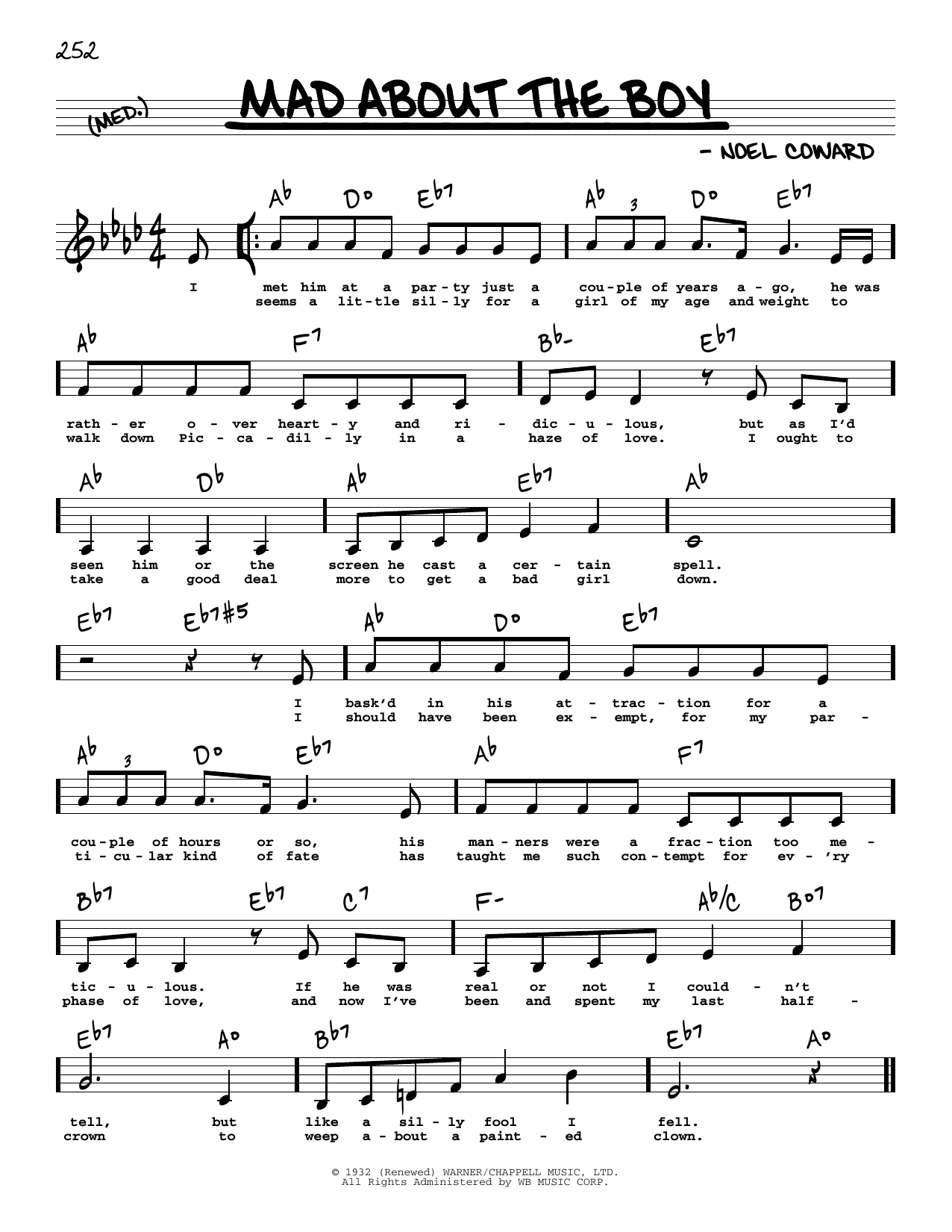 Download or print Noel Coward Mad About The Boy (Low Voice) sheet music, chords and digital score arranged for Real Book – Melody, Lyrics & Chords. This Jazz score includes 3 page(s).