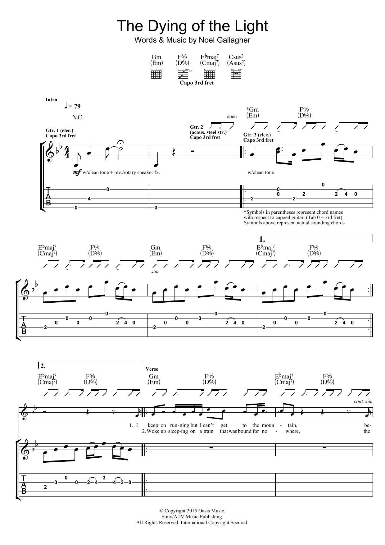 Download or print Noel Gallagher's High Flying Birds The Dying Of The Light sheet music, chords and digital score arranged for Guitar Tab. This Rock score includes 7 page(s).