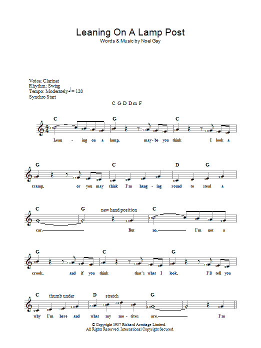 Download or print Noel Gay Leaning On A Lamp Post sheet music, chords and digital score arranged for Piano, Vocal & Guitar Chords (Right-Hand Melody). This Musical/Show score includes 4 page(s).