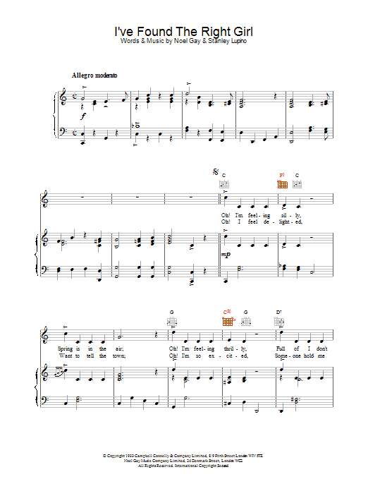 Download or print Noel Gay I've Found The Right Girl sheet music, chords and digital score arranged for Piano, Vocal & Guitar Chords. This Standards score includes 3 page(s).