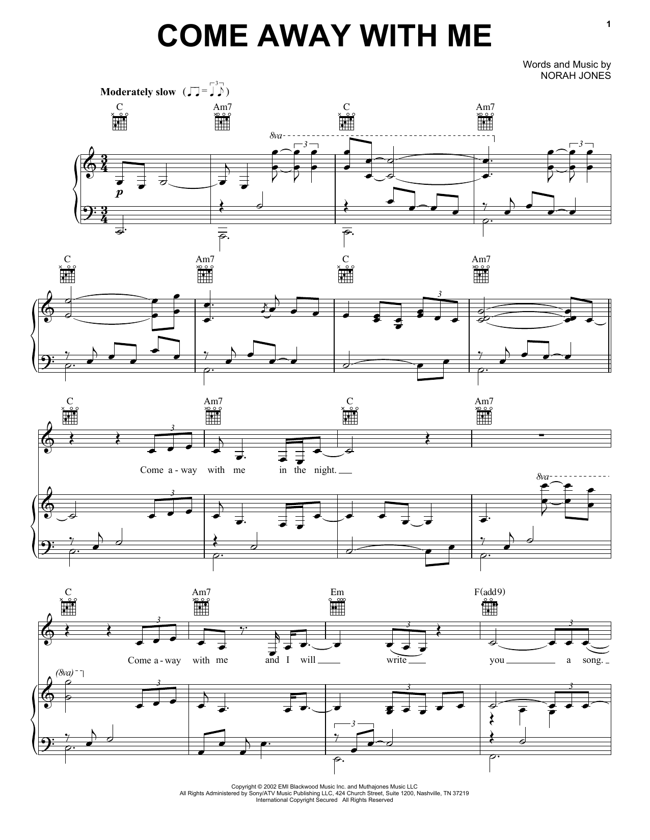 Download or print Norah Jones Come Away With Me sheet music, chords and digital score arranged for Piano Solo. This Jazz score includes 3 page(s).