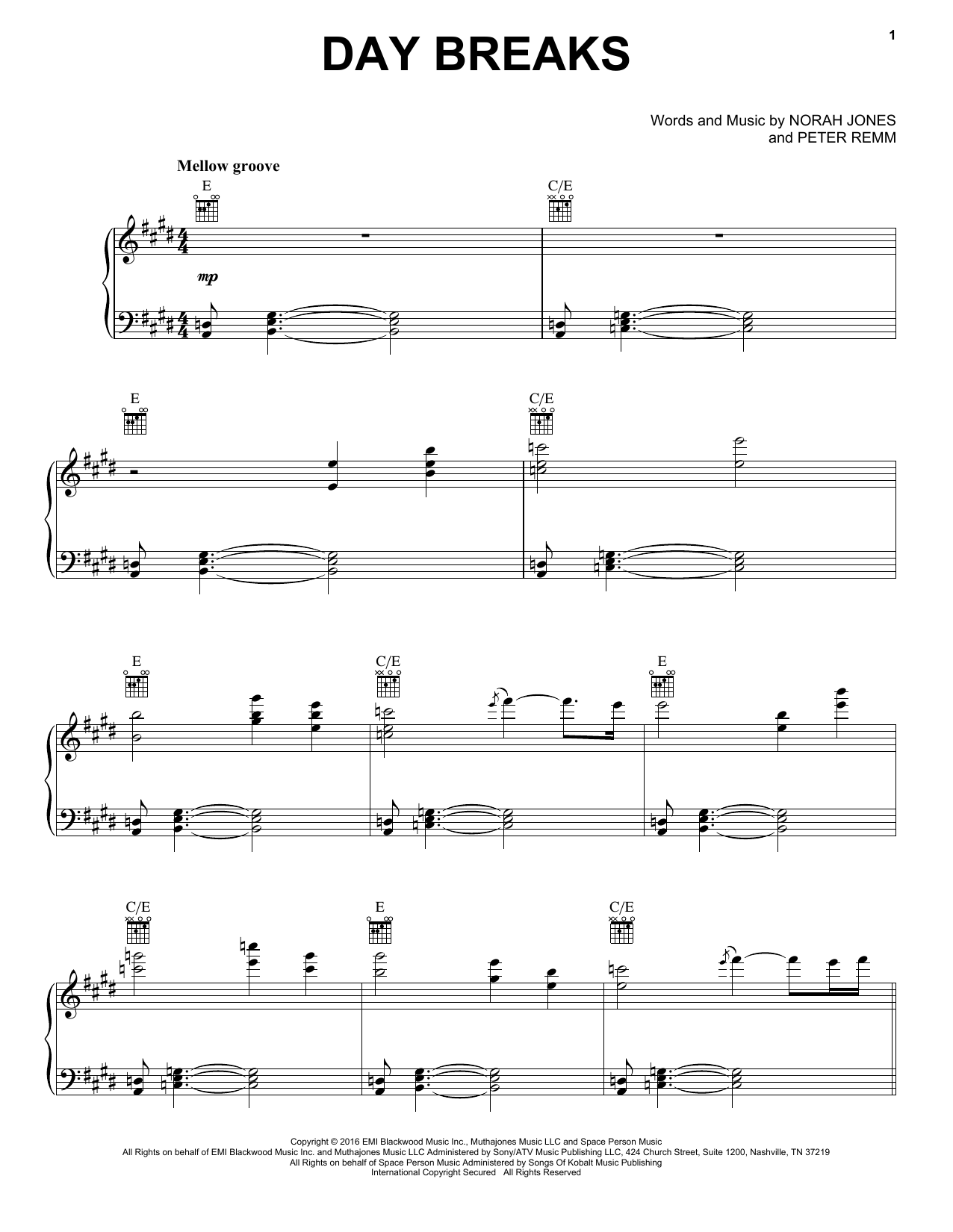 Download or print Norah Jones Day Breaks sheet music, chords and digital score arranged for Piano, Vocal & Guitar Chords (Right-Hand Melody). This Jazz score includes 5 page(s).
