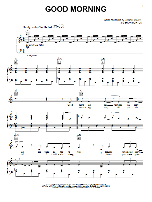 Download or print Norah Jones Good Morning sheet music, chords and digital score arranged for Piano, Vocal & Guitar Chords (Right-Hand Melody). This Pop score includes 4 page(s).