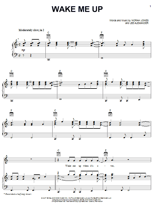 Download or print Norah Jones Wake Me Up sheet music, chords and digital score arranged for Piano, Vocal & Guitar Chords (Right-Hand Melody). This Jazz score includes 6 page(s).