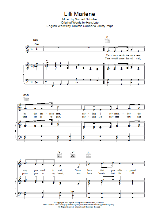 Download or print Norbert Schultze Lilli Marlene sheet music, chords and digital score arranged for Piano, Vocal & Guitar Chords. This Pop score includes 4 page(s).
