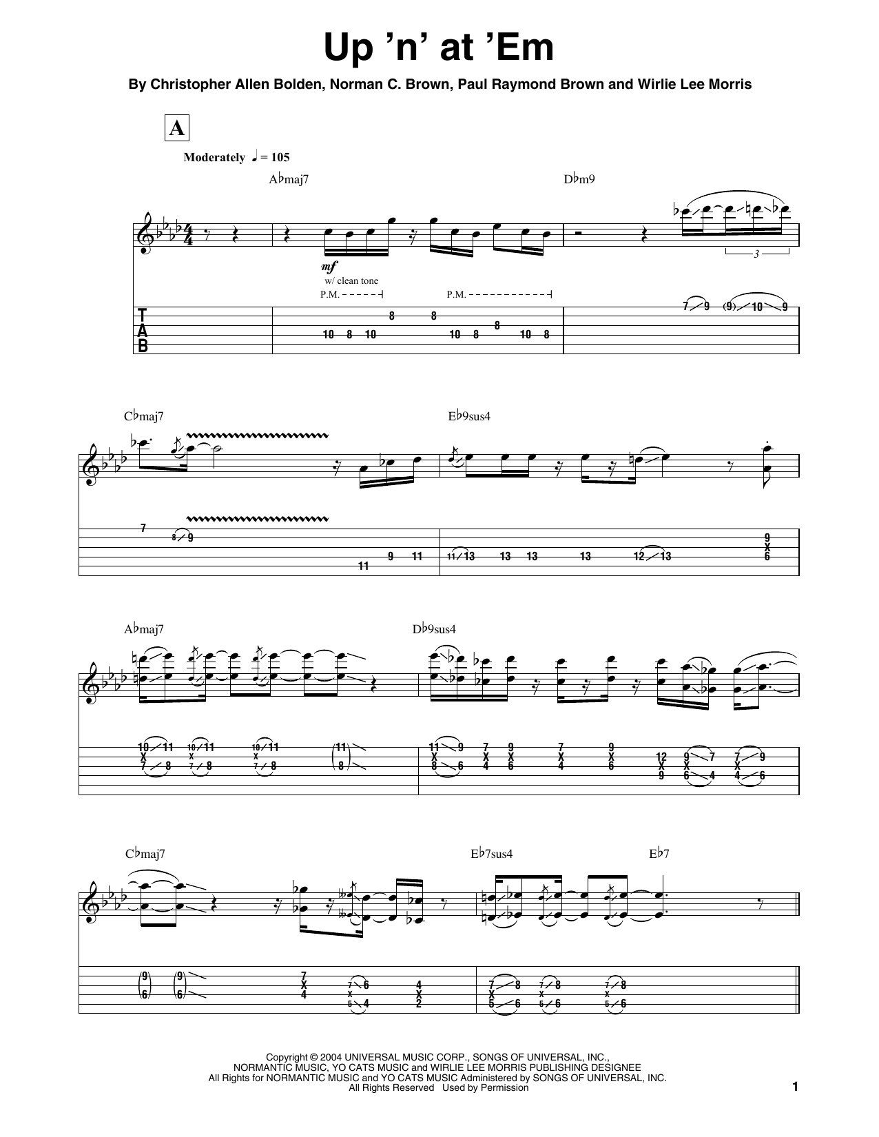 Download or print Norman Brown Up 'N' At 'Em sheet music, chords and digital score arranged for Guitar Tab (Single Guitar). This Jazz score includes 10 page(s).