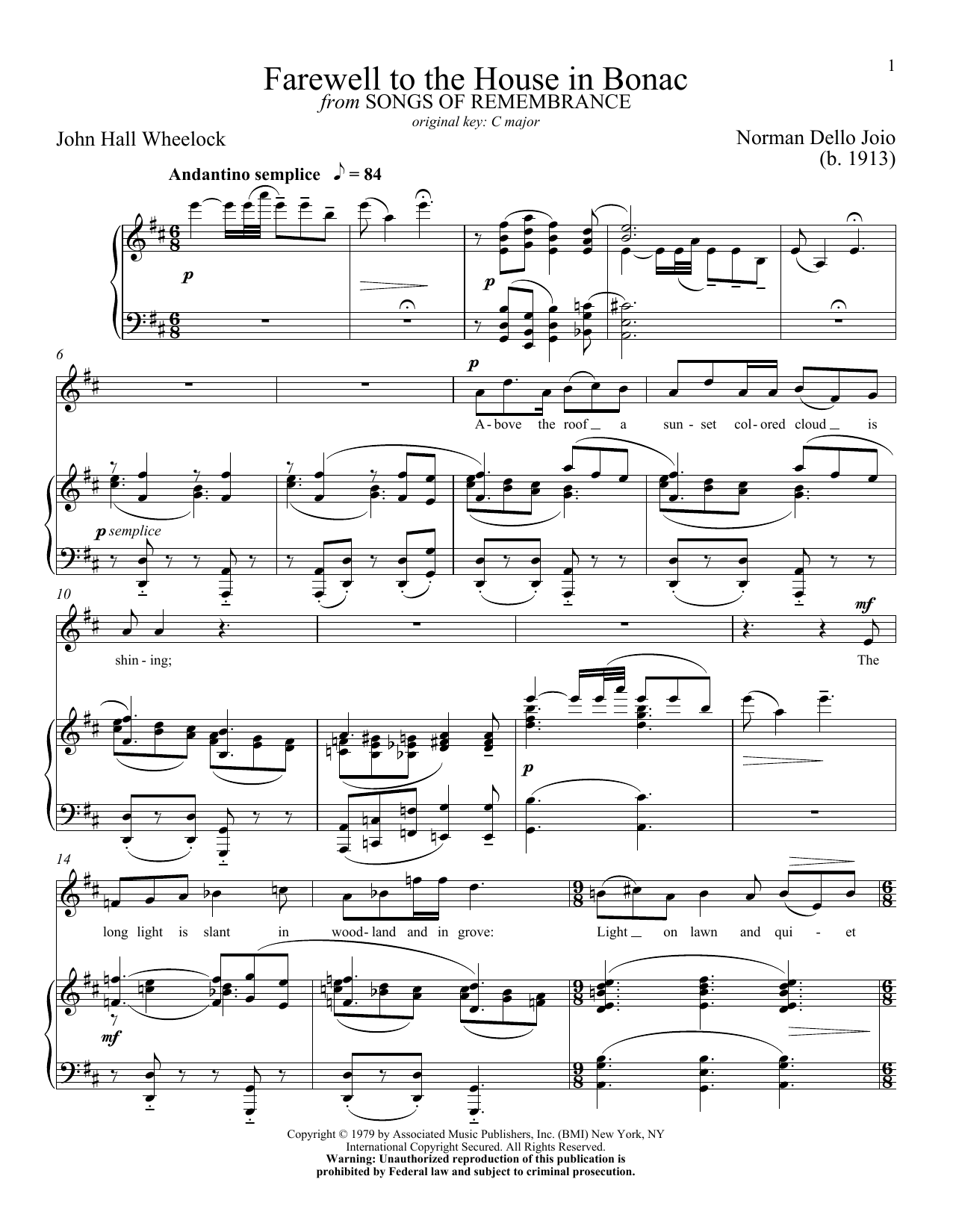 Download or print Norman Dello Joio Farewell To The House In Bonac sheet music, chords and digital score arranged for Piano & Vocal. This Classical score includes 3 page(s).