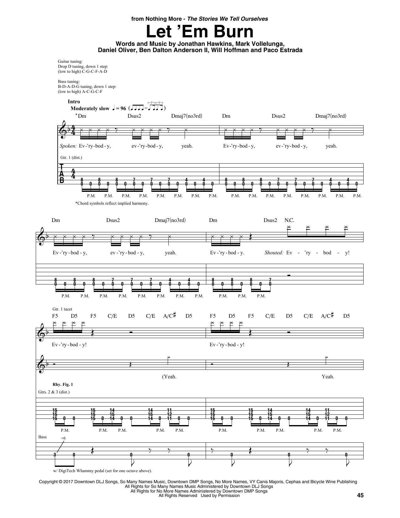 Download or print Nothing More Let 'Em Burn sheet music, chords and digital score arranged for Guitar Rhythm Tab. This Rock score includes 14 page(s).