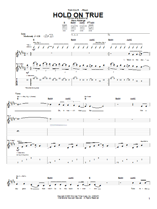 Download or print O.A.R. Hold On True sheet music, chords and digital score arranged for Guitar Tab. This Pop score includes 7 page(s).