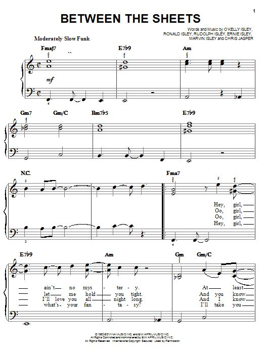 Download or print O'Kelly Isley Jr. Between The Sheets sheet music, chords and digital score arranged for Easy Piano. This Pop score includes 5 page(s).
