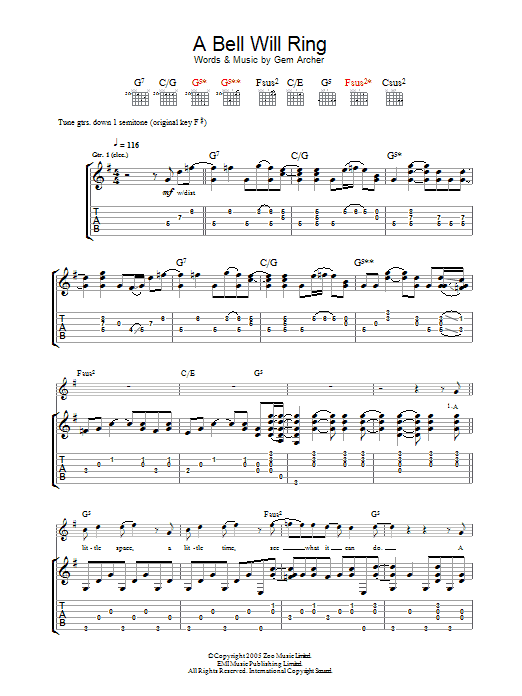 Download or print Oasis A Bell Will Ring sheet music, chords and digital score arranged for Guitar Tab. This Rock score includes 5 page(s).