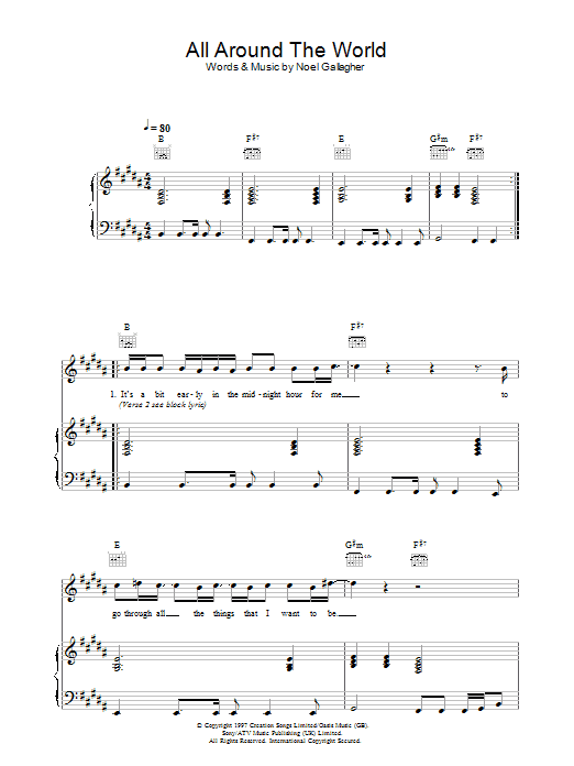 Download or print Oasis All Around The World (Reprise) sheet music, chords and digital score arranged for Piano, Vocal & Guitar Chords. This Rock score includes 10 page(s).