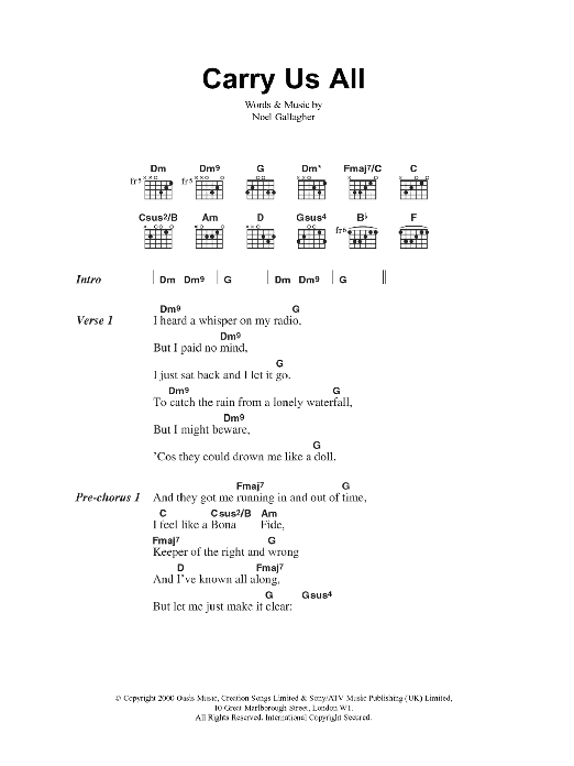 Download or print Oasis Carry Us All sheet music, chords and digital score arranged for Guitar Chords/Lyrics. This Rock score includes 3 page(s).