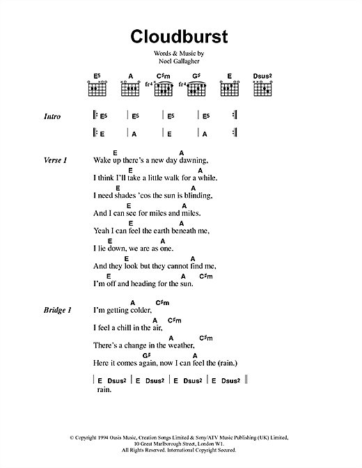 Download or print Oasis Cloudburst sheet music, chords and digital score arranged for Guitar Tab. This Rock score includes 5 page(s).