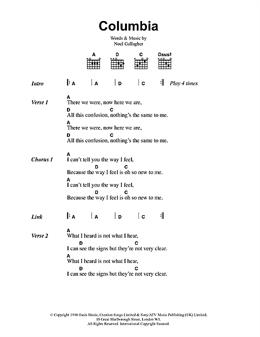Download or print Oasis Columbia sheet music, chords and digital score arranged for Piano, Vocal & Guitar Chords. This Pop score includes 4 page(s).