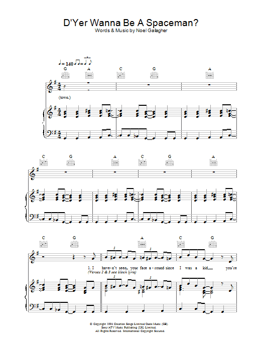 Download or print Oasis D'Yer Wanna Be A Spaceman? sheet music, chords and digital score arranged for Guitar Chords/Lyrics. This Rock score includes 2 page(s).