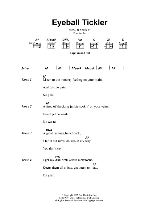 Download or print Oasis Eyeball Tickler sheet music, chords and digital score arranged for Guitar Chords/Lyrics. This Rock score includes 3 page(s).