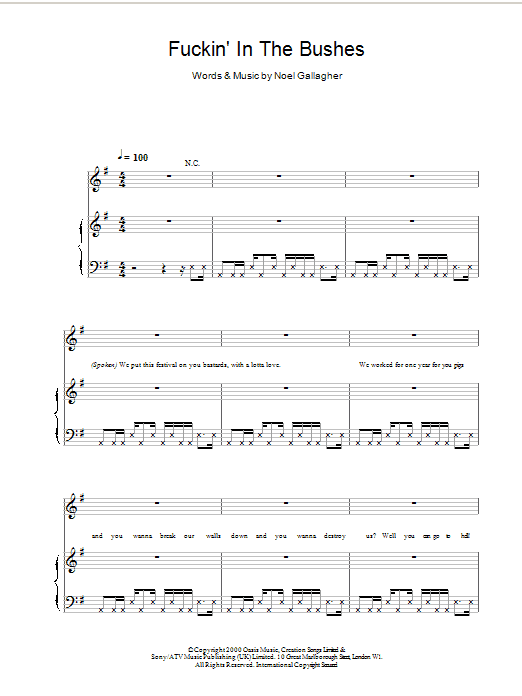 Download or print Oasis F***in' In The Bushes sheet music, chords and digital score arranged for Guitar Tab. This Pop score includes 5 page(s).