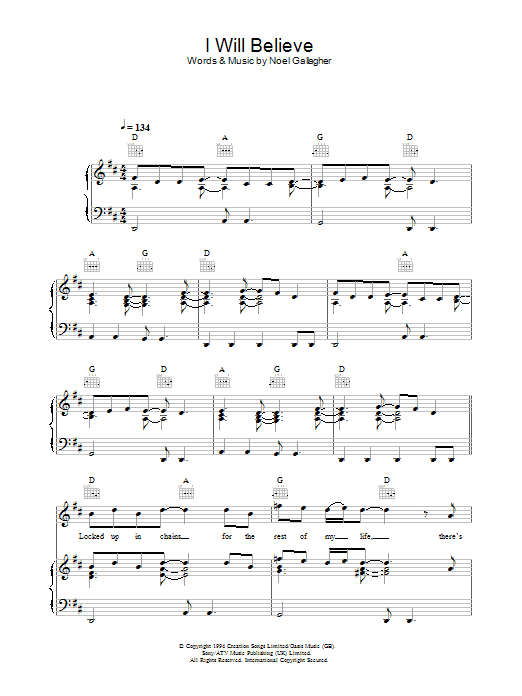 Download or print Oasis I Will Believe sheet music, chords and digital score arranged for Piano, Vocal & Guitar Chords. This Rock score includes 5 page(s).